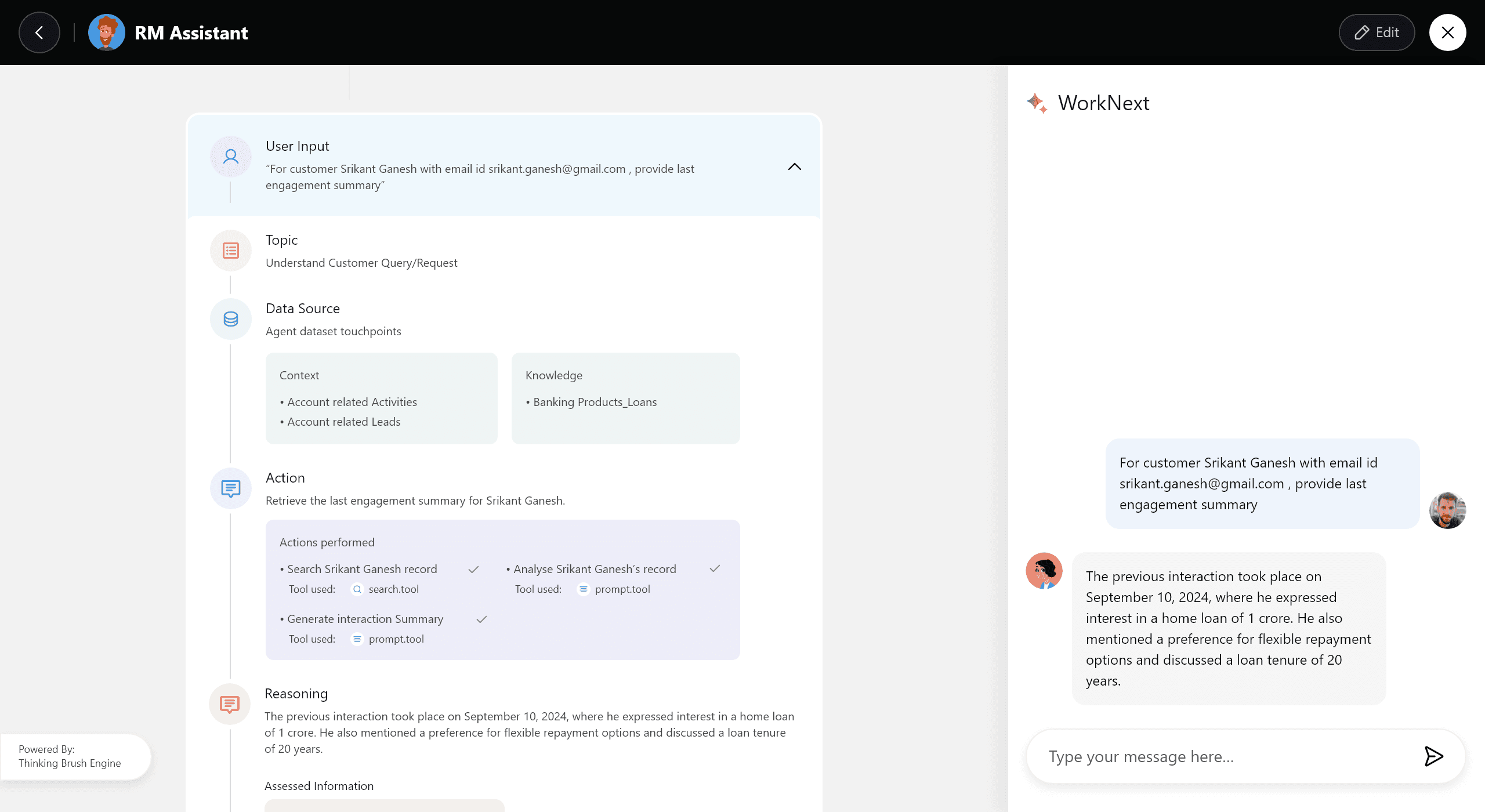 Each agent has a clear purpose: summarising customer health, flagging risks, preparing follow-ups, or recommending next best actions. Nothing feels vague or magical. Every agent exists for a reason the RM understands.