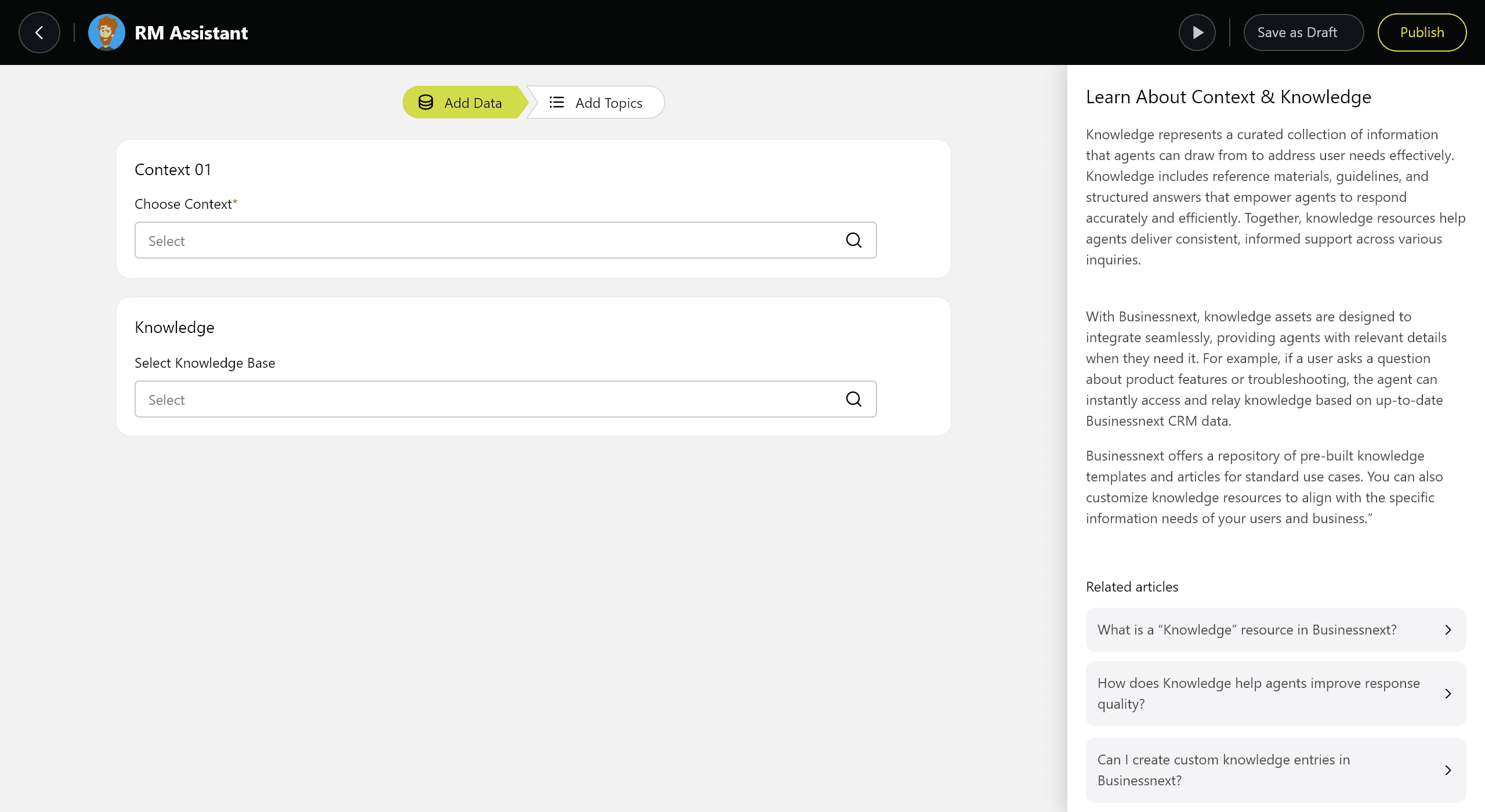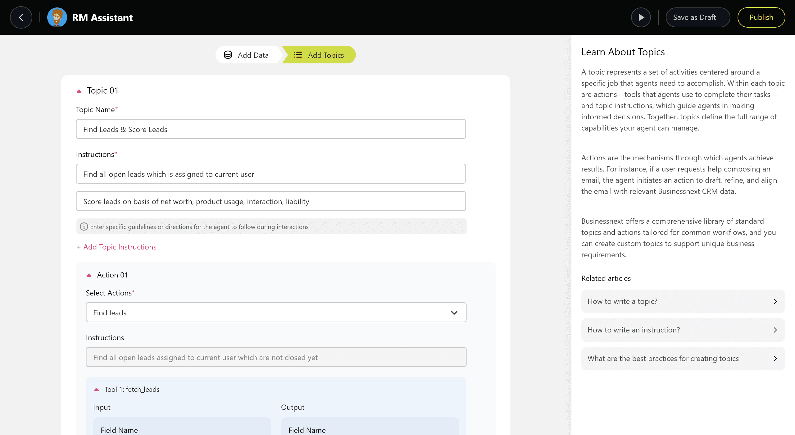 I led the design of an agent-based AI framework where Admins own configuration and training, and RMs only consume the results. Through the Agentic Dashboard, Admin users can create, train, and manage AI agents by defining topics, instructions and data sources. This ensures consistency, governance, and compliance across the organization.